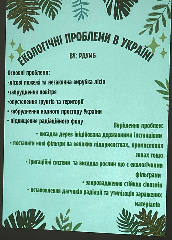 Особливу увагу приділили блоку «Еко-тайм», де учасники презентували власні плакати з креативними рішеннями екологічних проблем різних країн, демонструючи відповідальне лідерство та небайдужість до майбутнього планети.