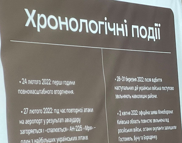Лідери з різних навчальних закладів підготували цікаві історії про захист нашої Київської області. Першою взяла слово учениця Бориспільського академічного ліцею Руслана Лесів, яка представила особисті фото літаків з аеропорту в Гостомелі та розповіла про перші дні боїв на цьому напрямі.