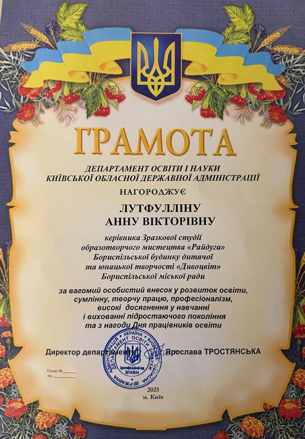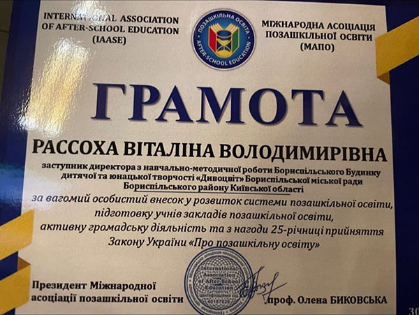 Подяки та грамоти виконавчого комітету Бориспільської міської ради отримали 12 працівників БДЮТ «Дивоцвіт»: Марія Рябчук, Ірина Тименко, Інна Ілляш, Олена Лоскутова, Анна Дідок, Віктор Власенко, Уляна Янкова, Ірина Гуржій, Марічка Власова, Надія Форостянко, Грамотою Департаменту освіти та науки - Анна Лутфуліна; Грамотою Асоціації позашкільників Украіни - Віталіна Рассоха; Нагрудним знаком «Василь Сухомлинський» - Наталя Тименко. Вітаємо, пишаємось своїми педагогами! Дякуємо міській владі, та управлінню освіти за високу оцінку нашої роботи! Дякуємо за подарунок - чудову виставу від муніципального театру.