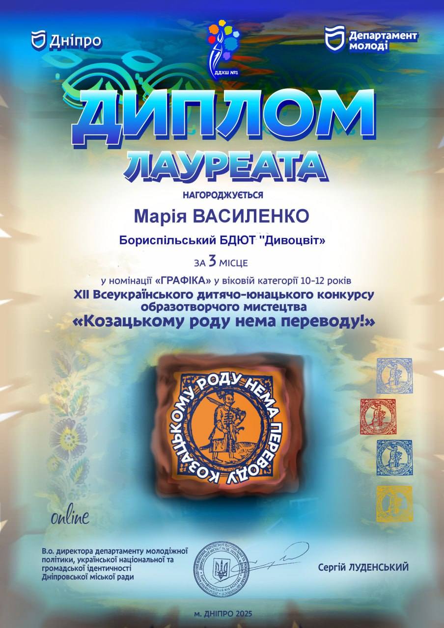 Із блискучими перемогами у ХІІ Всеукраїнському дитячо-юнацькому конкурсі образотворчого мистецтва “Козацькому роду нема переводу!” (м. Дніпро).