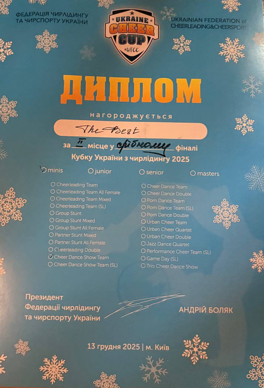 Вихованці клубу з чирлідингу "The best" (керівник Анна Проневич) стали переможцями у фіналі Кубку України з чирлідингу 2025! Вітаємо, пишаємось, так тримати!